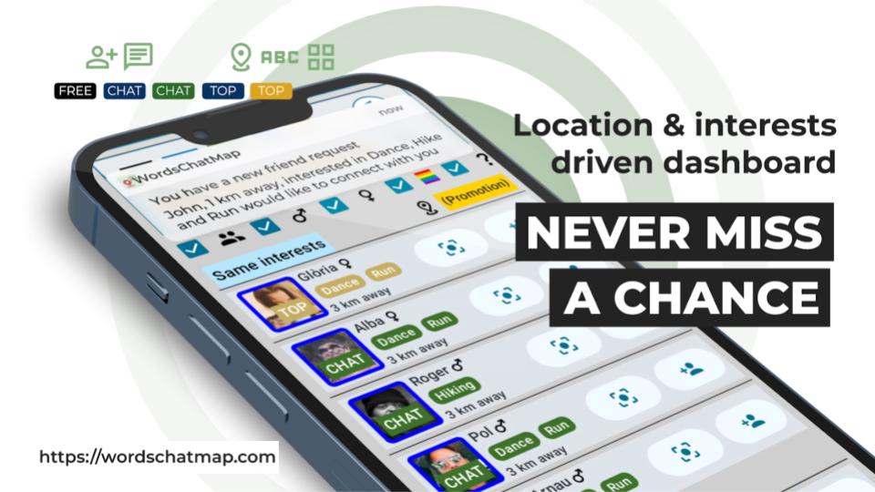 WhatsMap is an App to connect with like minded people close to you. Either using the built in Dashboard or the map screen connect with people close to your geographical location and your interests, send a connection request, chat and meet.